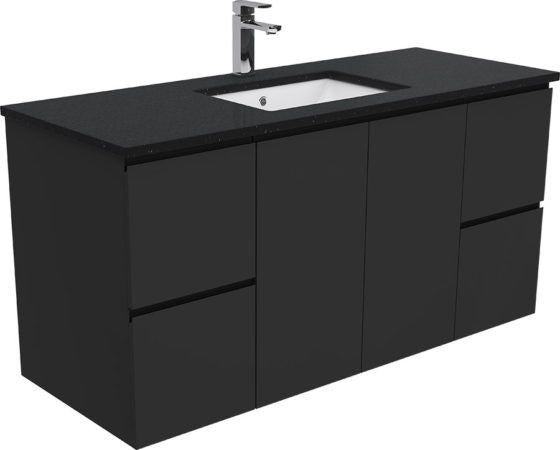 BLACK MATTE -1200W x 465D x 600Hmm stylish wall hung Matte Black vanity; Soft close fingerpull bevelled openings; Internal shelf; 1TH mixer port on ceramic top; Superior quality water resistant materials; Black stone top: Undermount square basin: Black pop up waste & overflow ring supplied;