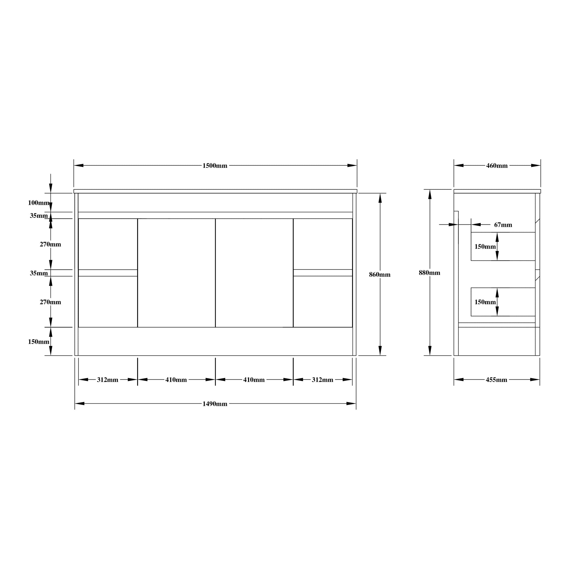 PVC 1500 x 460 x 880H with kickboard; White gloss vanity; 2 doors & 4 drawers; Fingerpull handleless & all soft close; Internal shelf; 100% Waterproof PVC superior quality finish. Chrome pop up waste supplied;