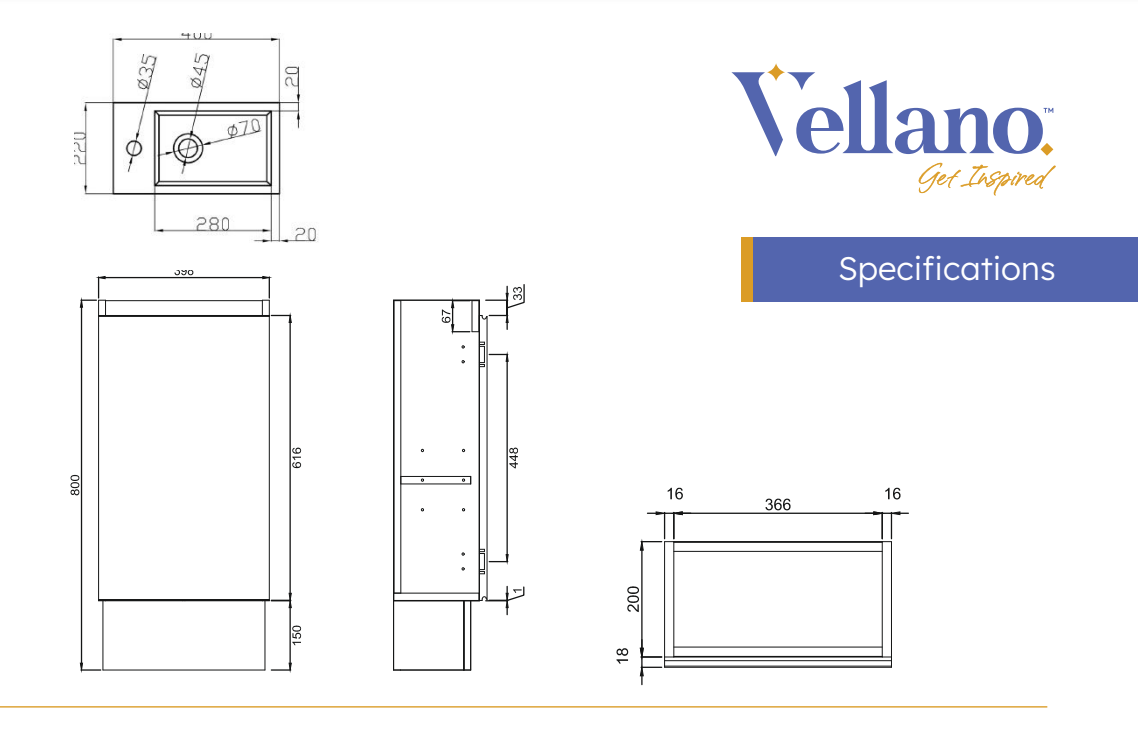 White Gloss pencil edge finish; Single door Finger-pull; Removable Kickboard or Wall Hung; Internal shelf; Quality water resistant materials; White Cast 50mm Poly Top - Reversable for Left or Right tap hole; 10 year warranty;